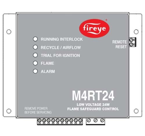 Fireye M4RT24-17 Burner Control, 5 sec Purge, 5 sec PTFI, recycle operation, 24V input voltage, Flame-rod or UV detection. Use with UV90L-2 scanner for UV detection application.
