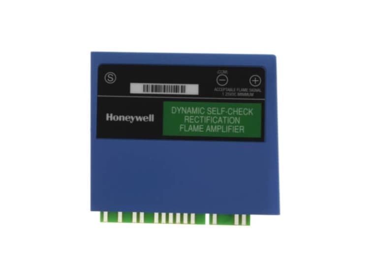 These solid-state plug-in amplifiers promptly respond to flame detector inputs, indicating the presence of flame when paired with Honeywell 7800 SERIES relay modules. Featuring a flame failure response time of 0.8 or 3.0 seconds, they offer flame signal test jacks for measuring amplifier flame signal voltage. The amplifiers plug into the 7800 relay module through a printed circuit board edge connector, keyed for proper orientation. Color-coded labels distinctly identify the flame detection type. The Dynamic Self-Check Amplifier tests detectors and all electronic components in the 7800 SERIES relay module, initiating a safety shutdown in case of flame detection system failure. This amplifier is compatible with existing Honeywell flame detectors, which need to be ordered separately.