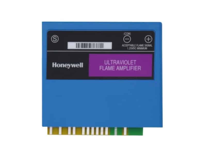 These solid-state plug-in amplifiers respond to flame detector inputs, indicating the presence of flame when paired with Honeywell 7800 SERIES relay modules. They easily plug into the relay module via a printed circuit board edge connector, keyed for proper orientation. Flame signal test jacks facilitate the measurement of amplifier flame signal voltage. Color-coded labels identify flame detection types. The Dynamic Self-Check Amplifier tests detectors and all electronic components in the 7800 SERIES relay module, initiating safety shutdown in case of flame detection system failure. It is compatible with existing Honeywell flame detectors (to be ordered separately).