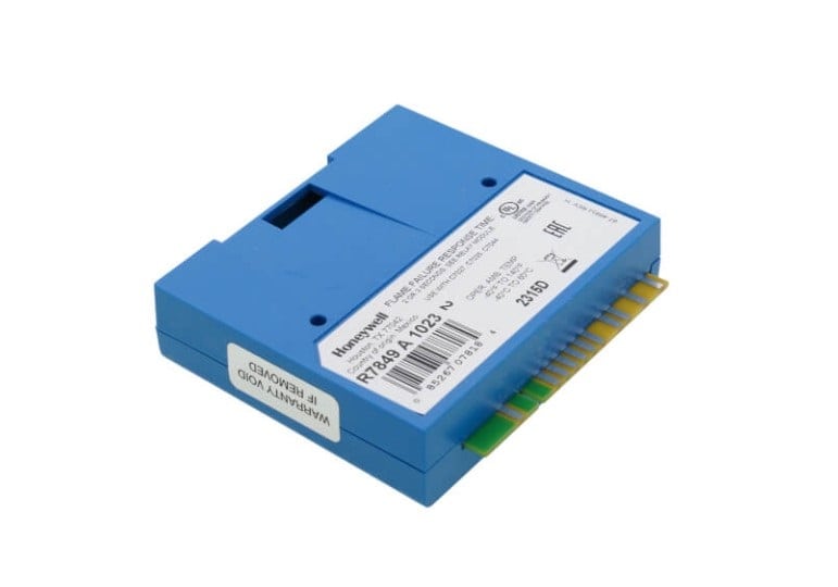 The Honeywell R7849A1023 Flame Signal Amplifier offers a Flame Failure Response Time of 2.0 or 3.0 seconds, lacks self-check functionality, and utilizes the Flame Sensor for Gas: Rectifying Flame Rods C7004, C7005, C7007, C7008, C7009, and Q179. Designed for use with the 7800 Series Primary Safety Control, it is Purple in color, and the Flame Signal Strength ranges from 0.0 to 5 Vdc.