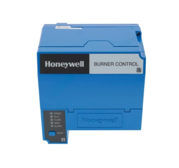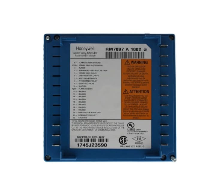 The Honeywell RM7897A2002 On-Off Primary Burner Control, an Automatic Primary Control with Programmable Post Purge, suits single burner applications with gas, oil, or combination fuel. Operating at 120Vac within a -40-140 degree ambient temperature range, it offers selectable recycle or lockout on airflow or flame loss, and features a Shutter Drive Output (RM7897A1002). To program post-purge, a S7800A1142 Display is required.