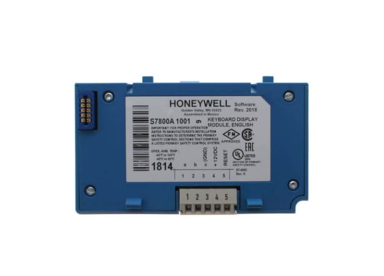 The Honeywell S7800A1001 Keyboard Display Module operates at a peak fullwave rectified voltage of 13Vdc, designed for English Language use, with an ambient temperature range of -40 to 140 degrees. It provides real-time status updates on burner sequence, timing, hold, and lockout information, including selectable messages.