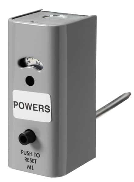 Siemens 141-0530, Duct-mounted High Temperature Limit Thermostat for “lock-out” control has a single setpoint with exposed setpoint indicator, single-pole, single-throw switch action, manual reset, 25 to 215 degrees Fahrenheit setpoint range, and a gray enamel cover.